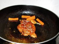 转小火煎至两面都金黄色,后加入胡萝卜条一同煎制片刻。再将蝴蝶排上撒上孜然粒,煎出孜然的香味即可。