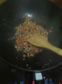 3.炒锅下油烧热,下入蒜姜末、香菇胡萝卜丁、下入肉末炒一分钟加入辣鲜露和少量的盐起锅