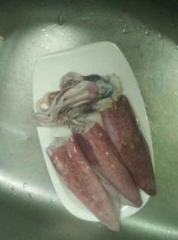 2.清理鱿鱼,取出内脏和软骨还有鱿鱼头内的嘴,清洗干净(备用)