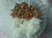 香菇和胡萝卜都切成小丁,猪肉剁成肉末,生姜和蒜头也剁碎。(辣鲜露可换成生抽,因为我家喜欢吃辣的,辣鲜露可是经常上 厨王争霸 的噢,吃过辣鲜露的人都会爱上它的)