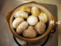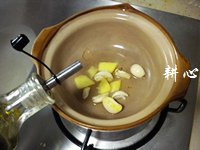 砂锅洗净,放入姜片和蒜头爆香,再倒入适量的粟米油。